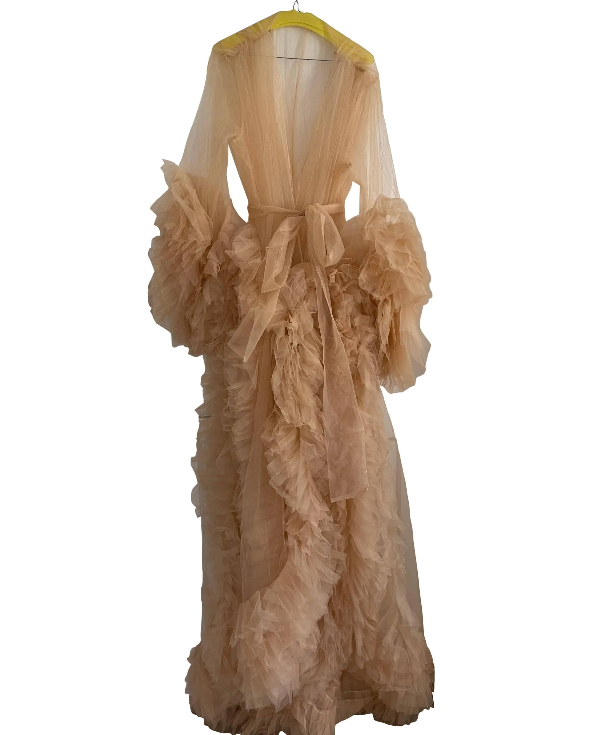 The stunning Gigi Tulle Robe with organza ruffles is showstopper piece for your photo shoot or special occasion. It is full of volume and drama, with endless ruffles, and a long train. Once stepped into, it will transform you into a goddess.Â
