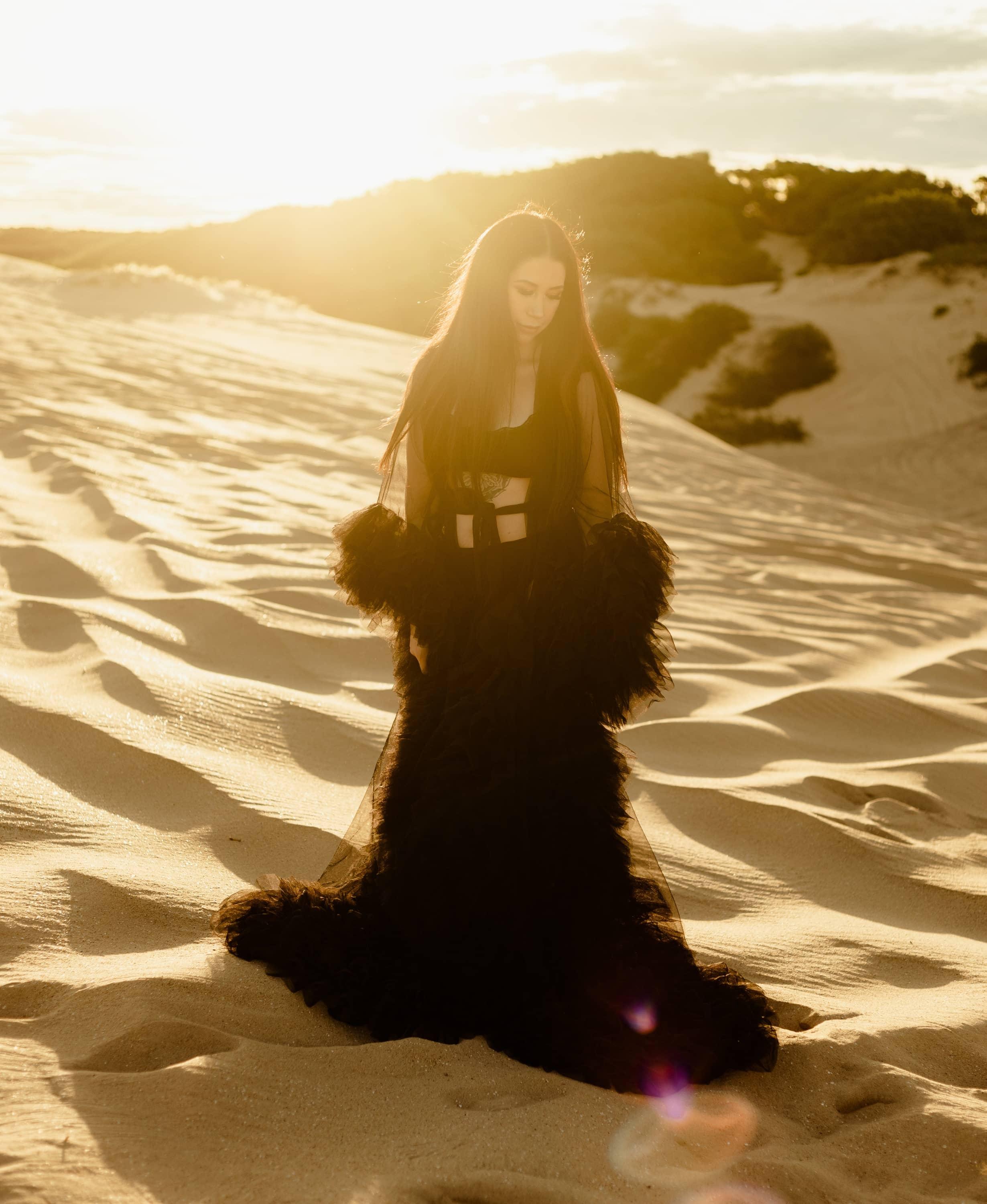 The Gigi Tulle Robe in Black adds a touch of drama and intensity to your look, making it perfect for maternity photos or or intimate boudoir photos.